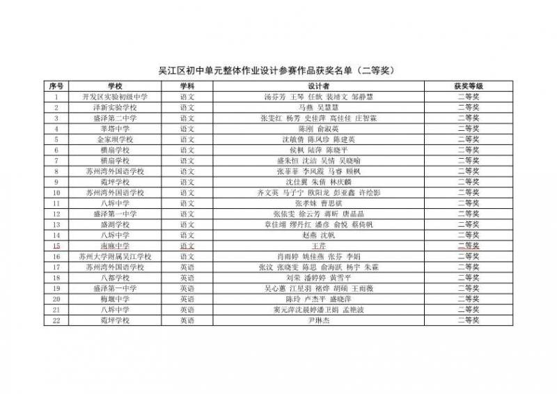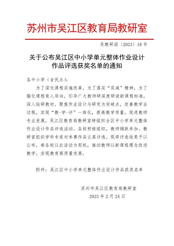 吴江区首届中小学单元整体作业设计作品评选获奖